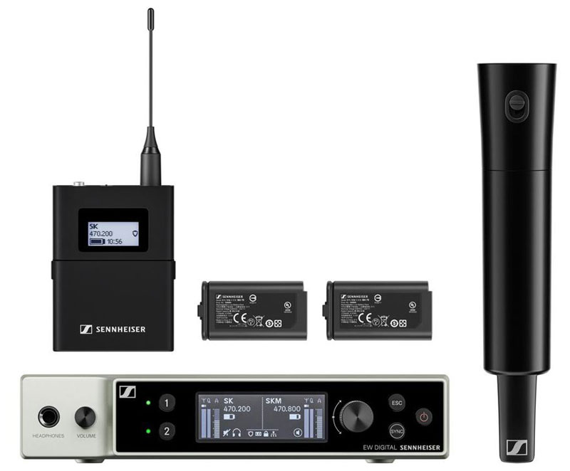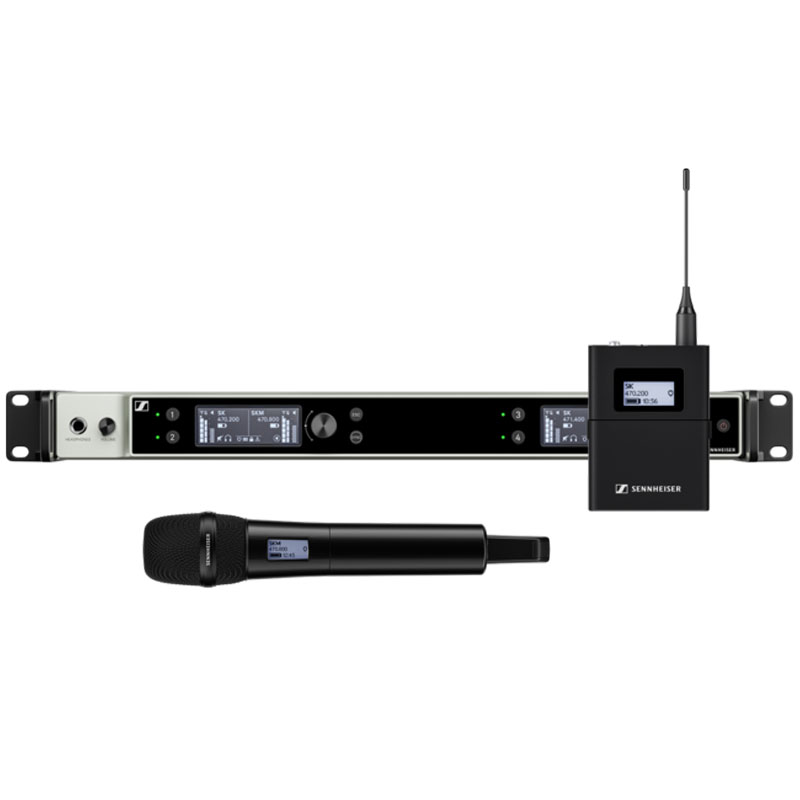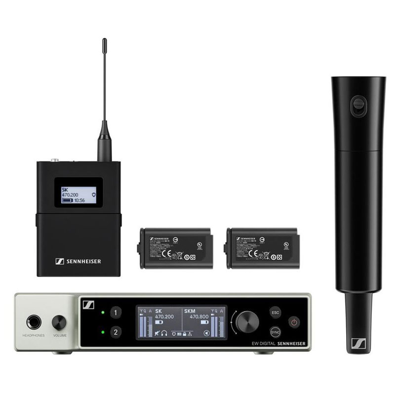 这个组合套装包含如下:1个 EW-DX SKM-S (手持话筒带静音开关), 1 个 MMD 835 音头单元(心形指向, 动圈), 1 个 EW-DX SK (无线腰包发射器), 1 个 MKE 2 (全指向领夹麦克风), 1 台EW-DX EM 2 机架式接收机 (2 通道) 和 2 块BA 70 可充电电池组
